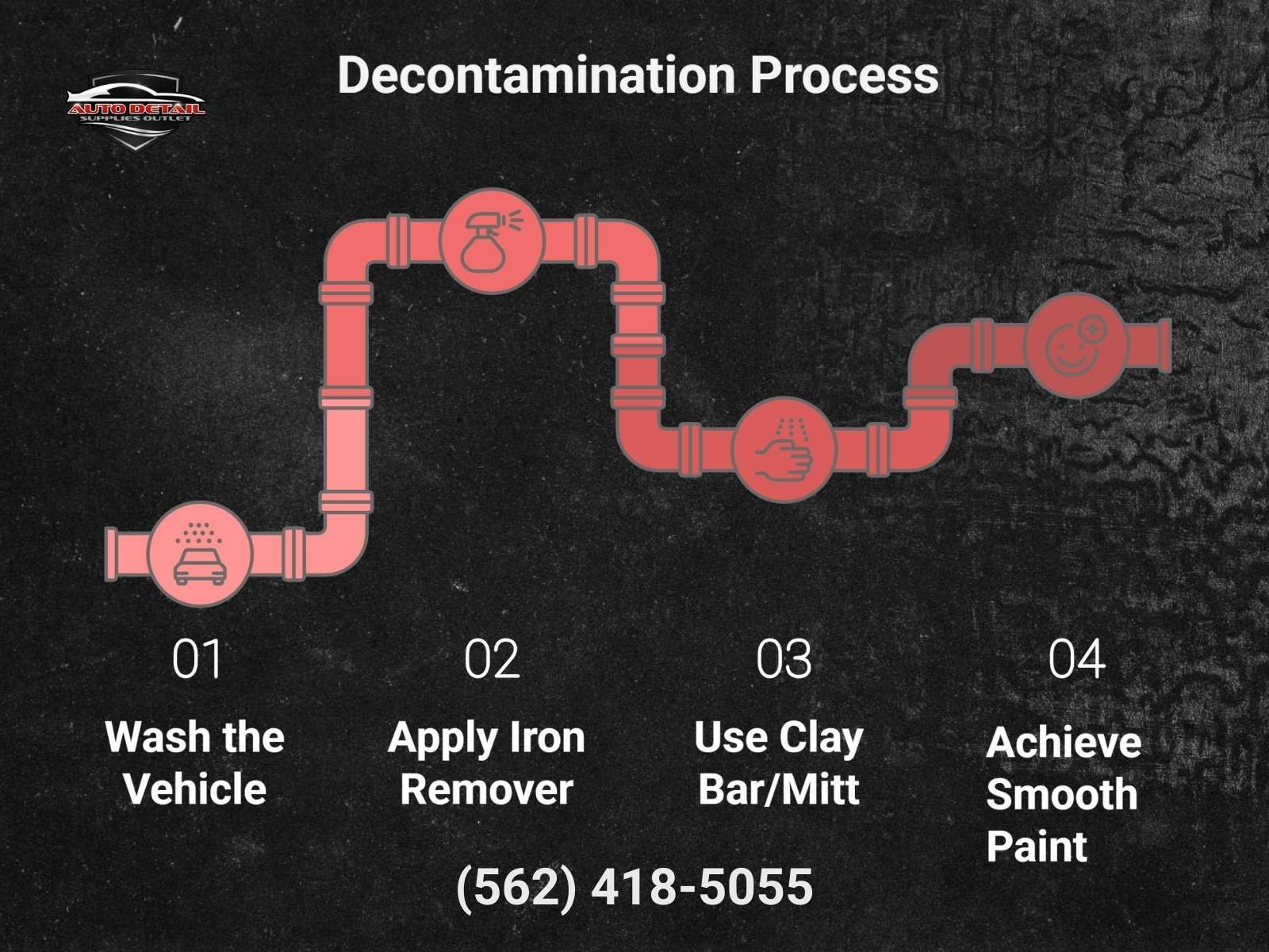After washing, decontamination removes embedded contaminants that a normal wash cannot. This includes using an iron remover to dissolve brake dust and a clay bar or clay mitt to physically remove bonded tar, sap, and industrial fallout, leaving the paint perfectly smooth.